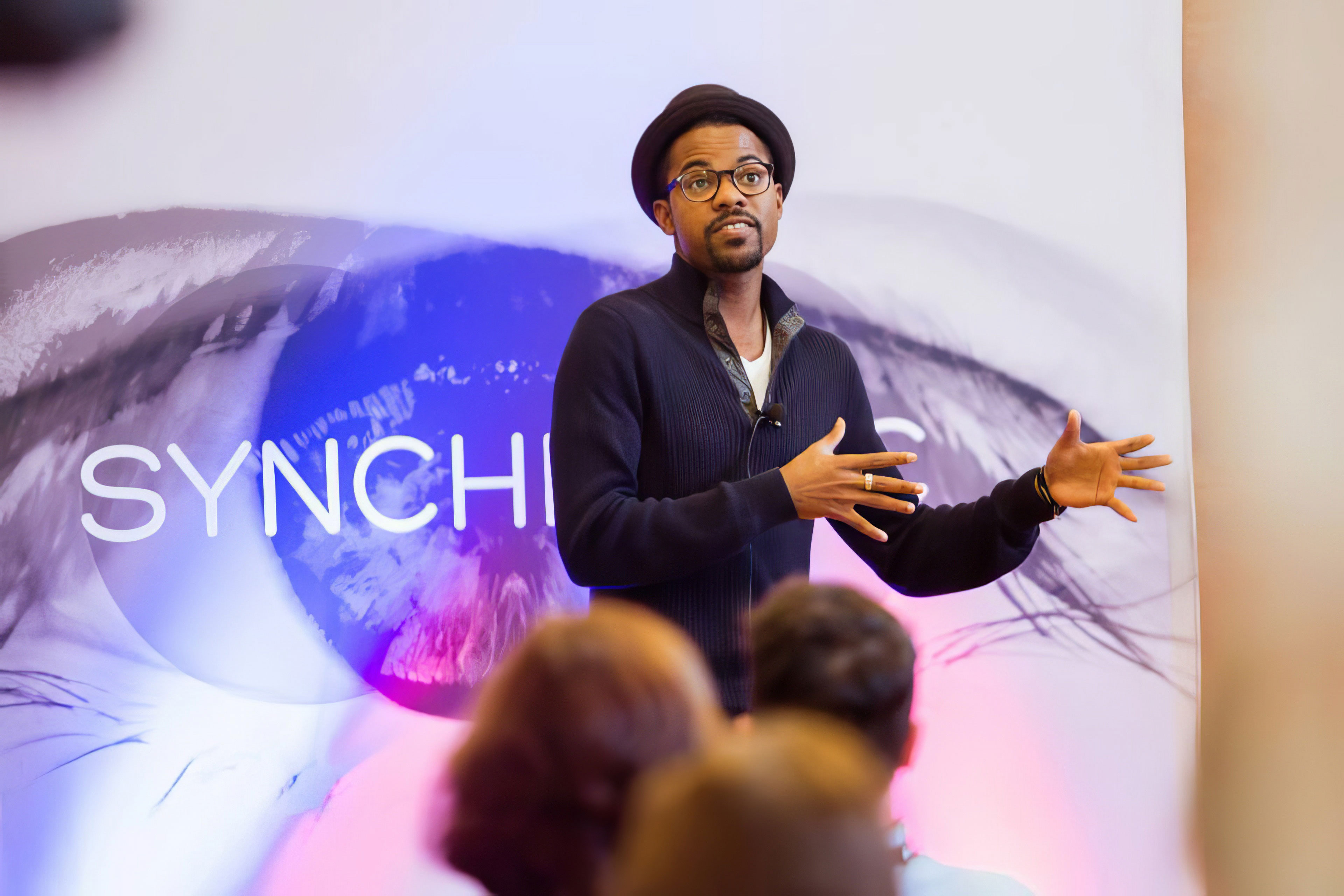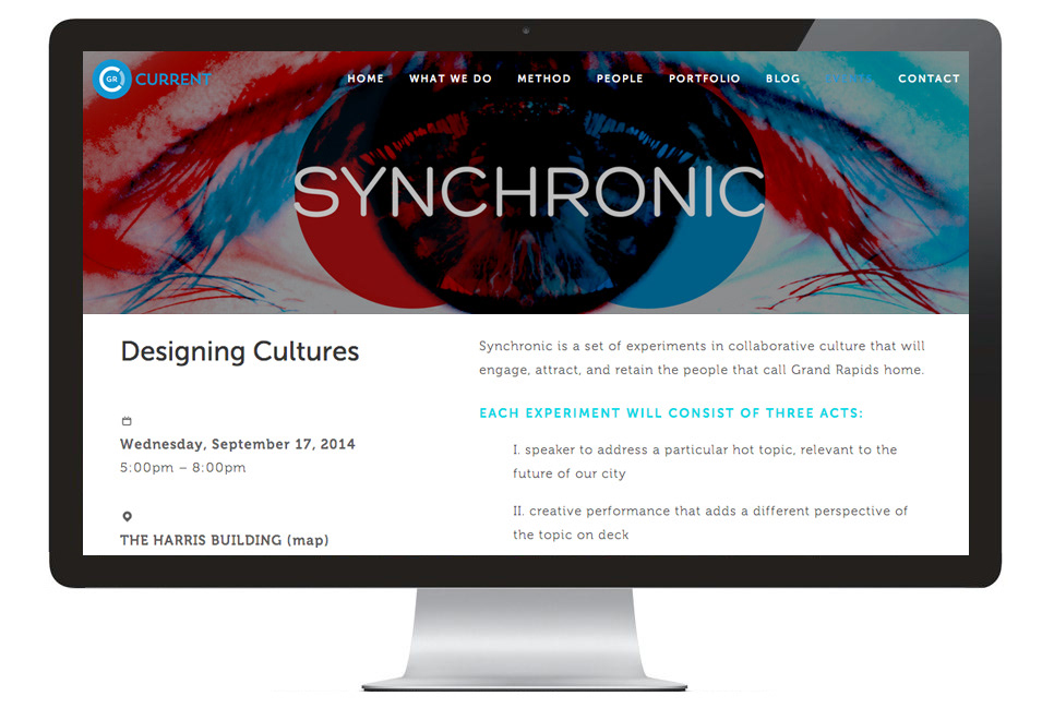 Synchronic was a series of experimental events dedicated to designing a collaborative culture to engage, attract, and retain creativity within the city of Grand Rapids, Michigan. It was produced by local business incubator non-profit GR Current. The events consisted of a speaker to address a particular topic, a creative performance, and breakout sessions. The brand identity consisting of the anaglyphic eyes allude to a perspectives coming together. This work was selected for the West Michigan Graphic Design Archives.